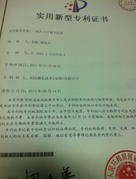 在我司研发部和客户积极配合进取下,我司又推出一款适合不同管径大小,不需要使用专用工具就可以收紧的可调节扎带。并喜获专利证书!