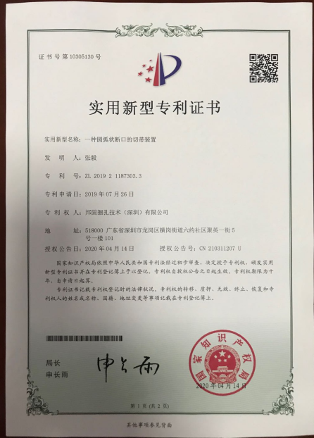 在生产和生活中,由于不锈钢扎带不受捆扎物体形状和尺寸的限制,简单的扎扣结构简化了抱箍,卡箍的复杂性,良好的紧固性能保证了被捆扎物体的安全,因此人们常用不锈钢扎带,尼龙扎带进行捆扎。当物体被捆扎后,长需将多余的长度的扎带切断,传统紧固工具切割后留边较长,切口是平直的,尤其是金属扎带的切口具有锐角,容易割伤手指,且不能通用各种规格的金属扎带。邦固捆扎技术(深圳)有限公司本次获得的新型专利就是提供了一种圆弧状端口的切带装置,该圆弧状断口的切带装置结构简单。使用方便,不但切割后的留边较短,而且切割后的断口为弧形,不易割伤工作人员,可适用于多种规格的金属扎带,尼龙扎带的切割。